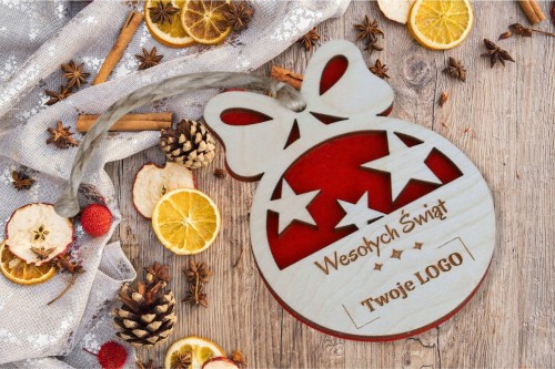Bombka na choinkę z logo lub nazwą firmy.