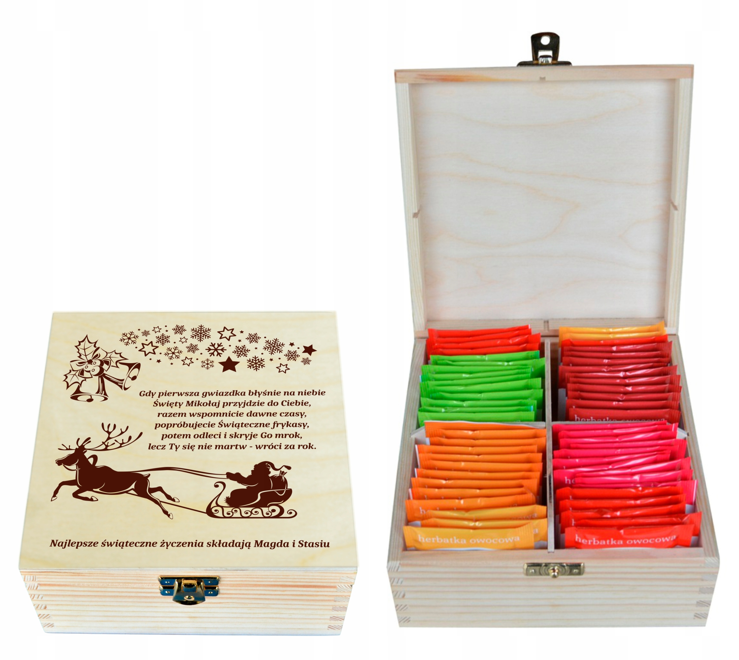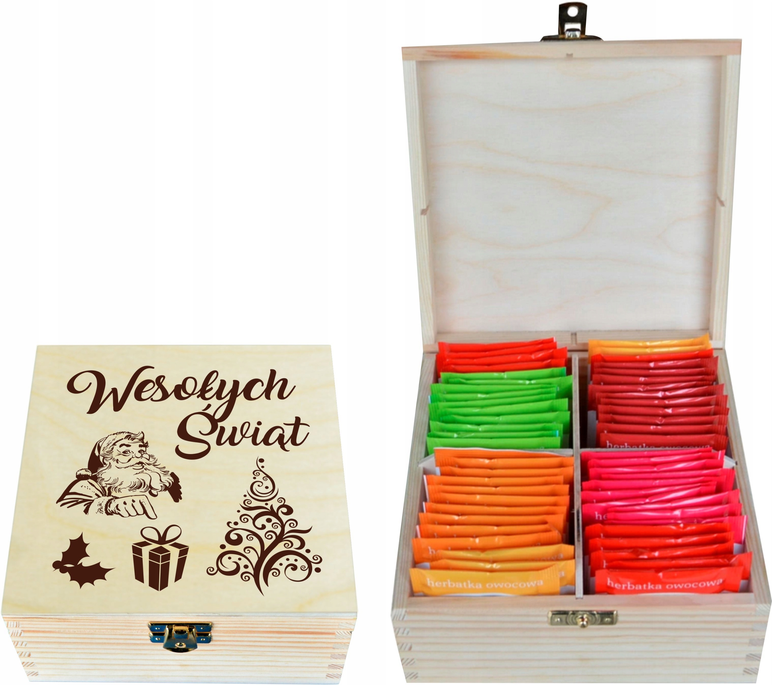 CUDOWNE, DREWNIANE PUDEŁKO NA HERBATĘ Z 4 PRZEGRÓDKAMI! PREZENT NA ŚWIĘTA 2020