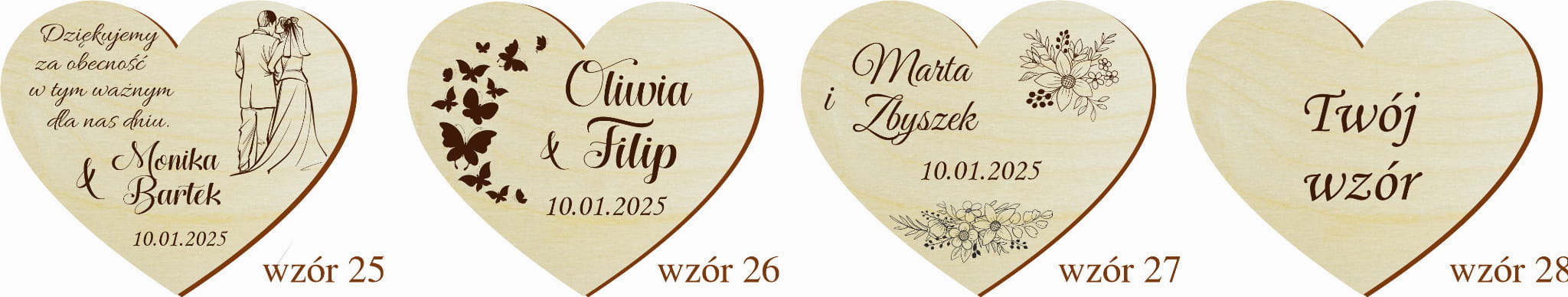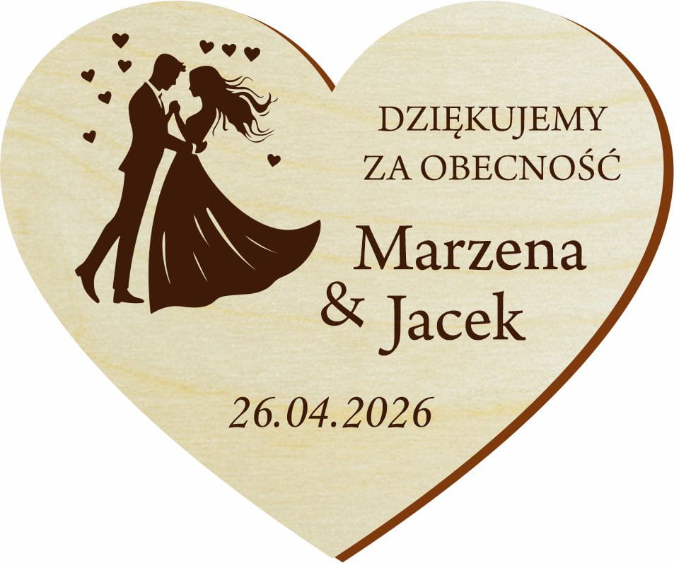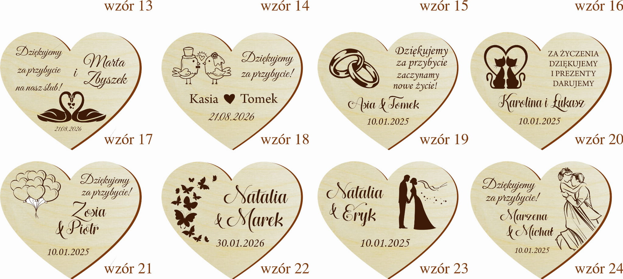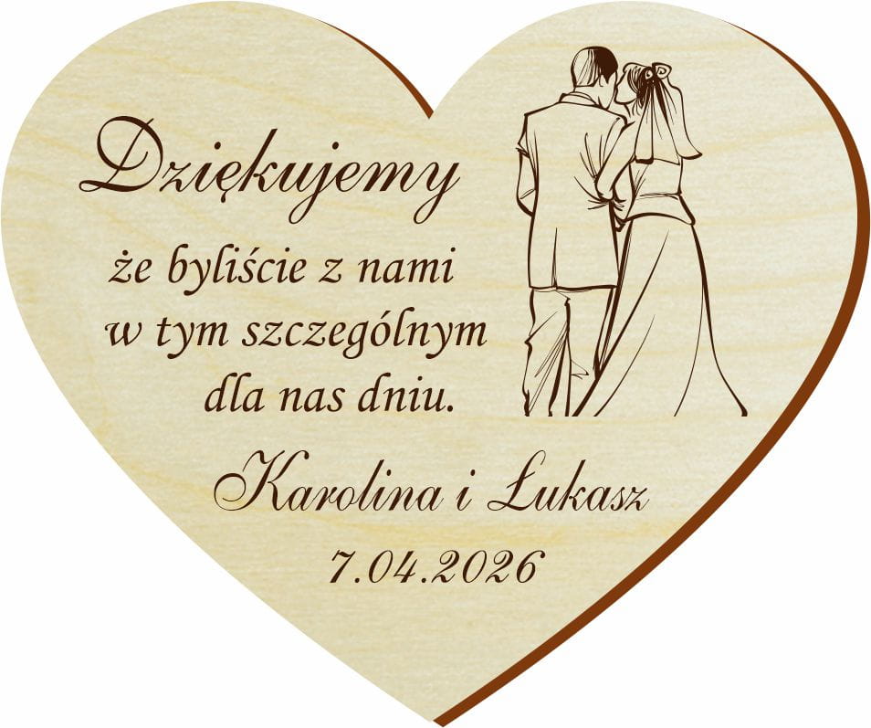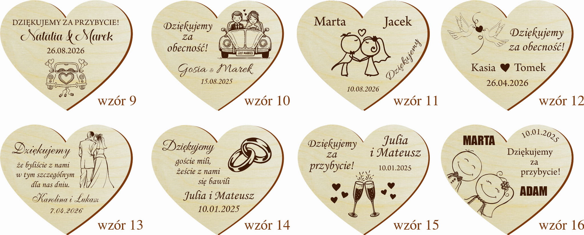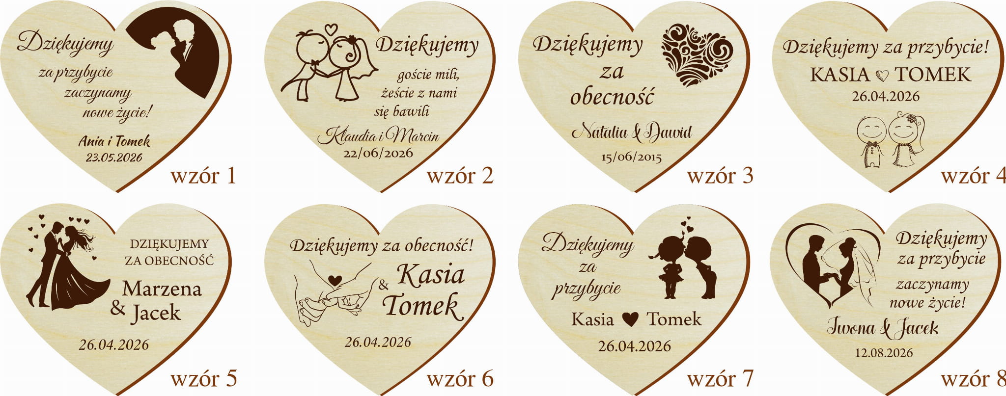 Romantyczny wybór dla par, które chcą podkreślić miłość i emocje towarzyszące temu dniu. Drewniane serca mogą mieć wygrawerowane podziękowanie dla gości.