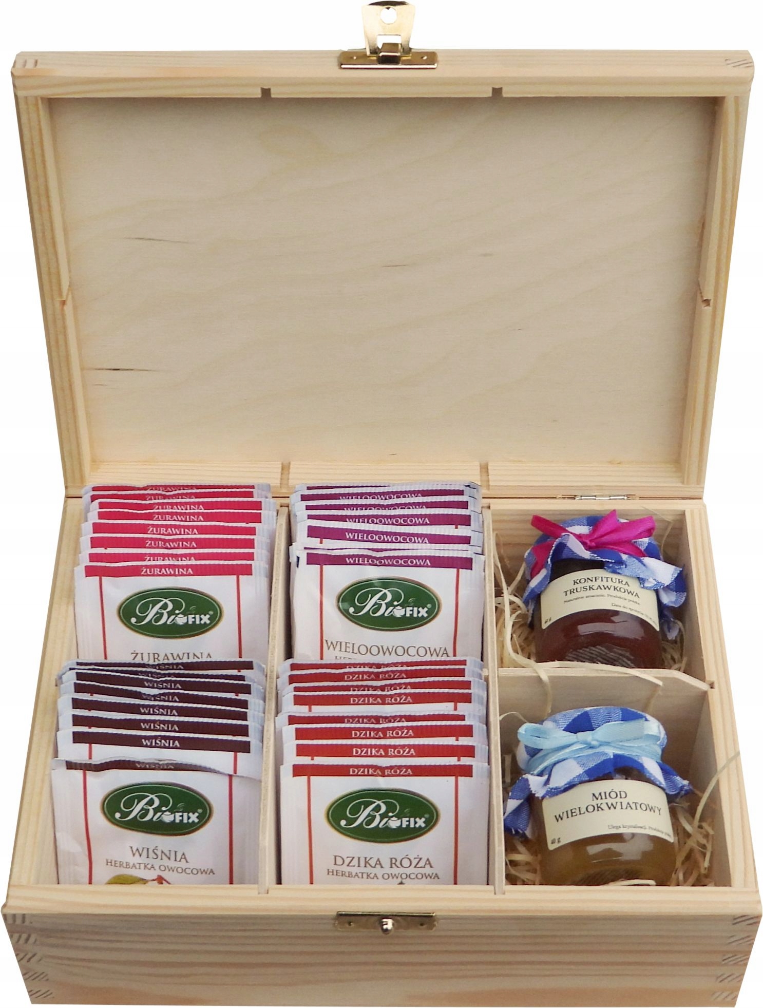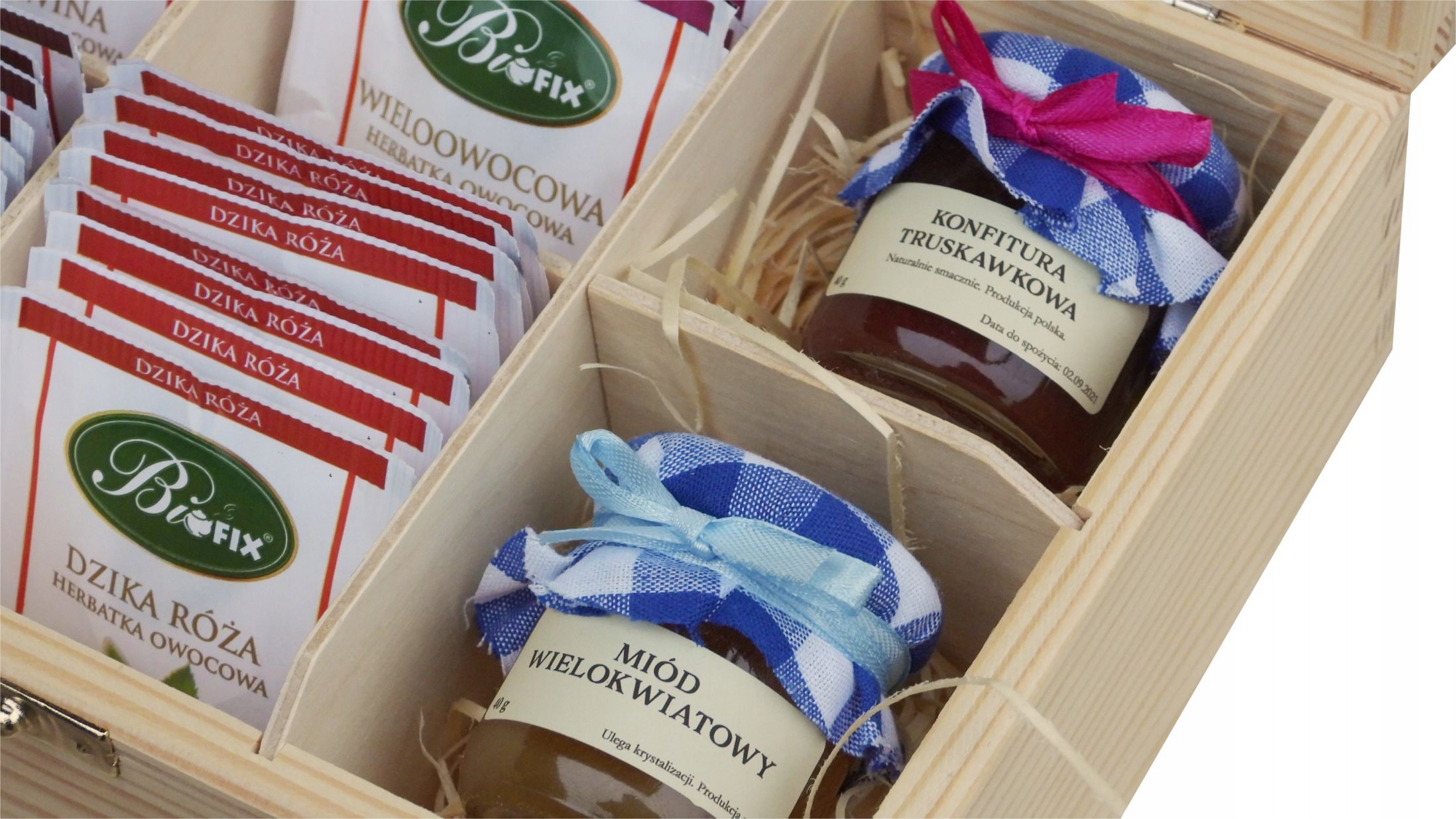 - 6 komór na ulubioną herbatkę plus dwa słoiczki ze słodkościami. Praktyczny solidny prezent.