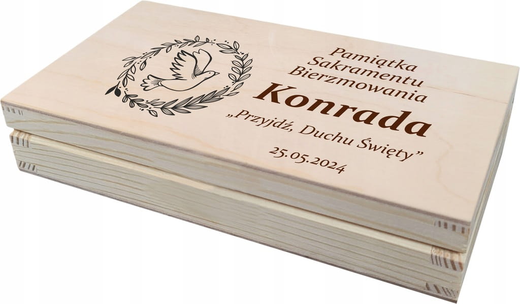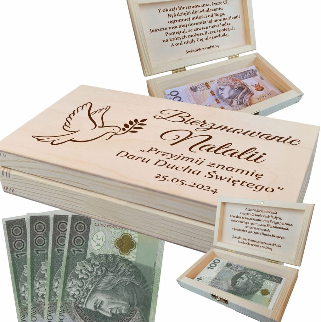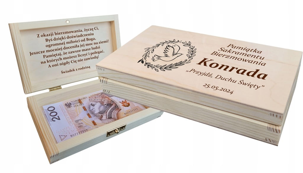 Pudełko na pieniądze PAMIĄTKA PREZENT NA BIERZMOWANIE grawer życzenia imię