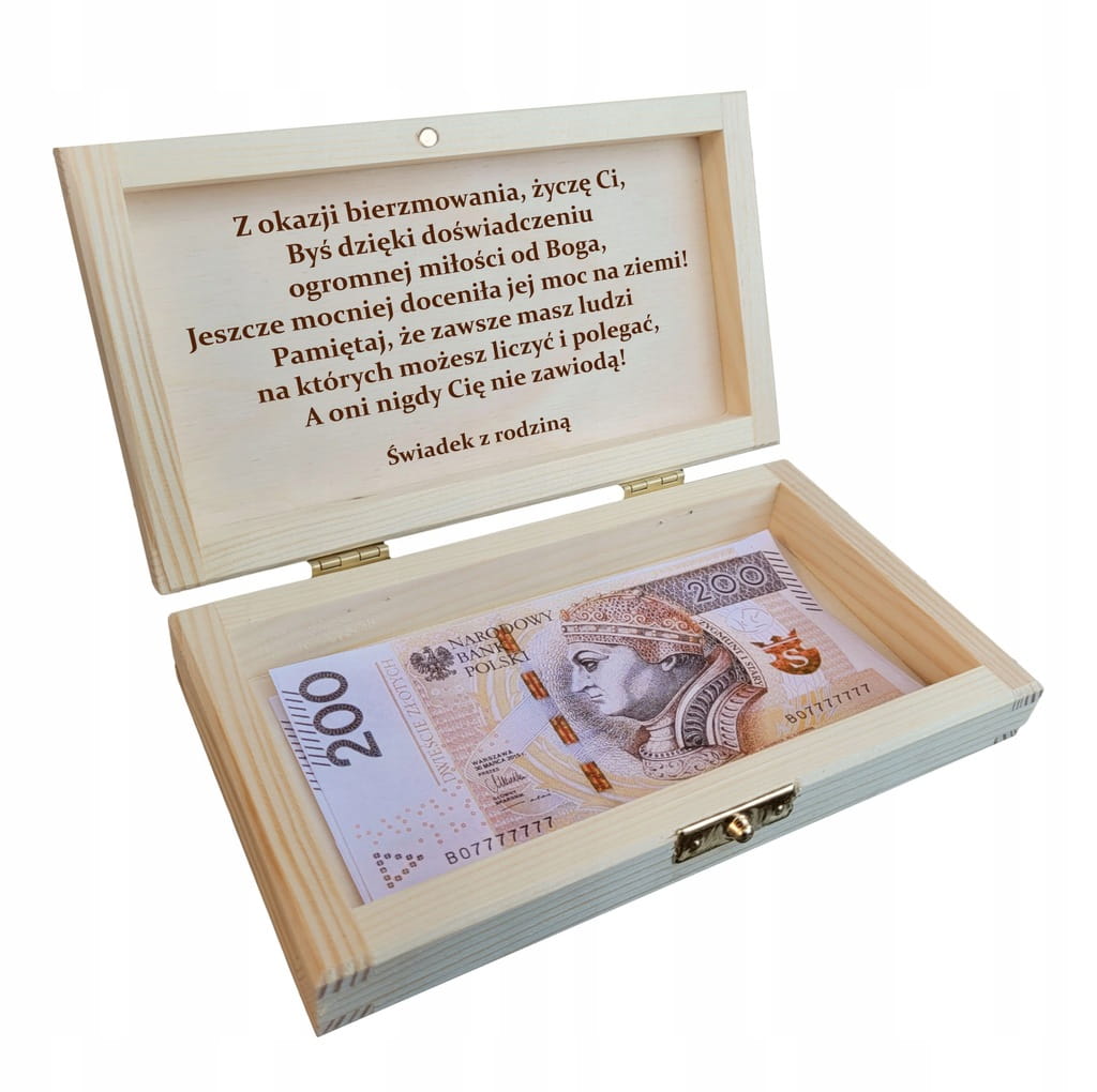 Chcesz elegancko wręczyć prezent w postaci gotówki? Mamy dla Ciebie rozwiązanie - pudełko na pieniądze na bierzmowanie, grawerowane pudełko jest idealnym prezentem. Prezent 3 w jednym: etui na banknoty, życzenia zastępujące kartkę oraz pudełko, które będzie pamiątką może służyć jako pudełko na drobiazgi.