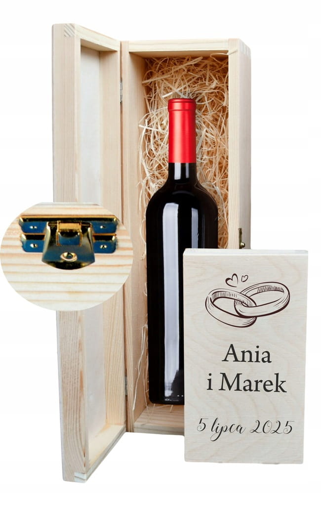 Idealna pamiątka ślubu, w środku skrzynki na wino wypełnienie wełną drzewną, natomiast na wewnętrznej stronie pudełka na pieniądze Twoje wybrane życzenia.