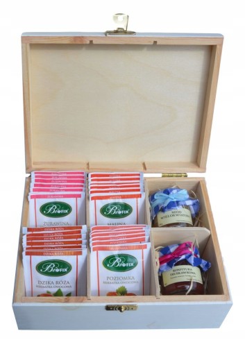 - Pudełko pełne wyśmienitej herbaty w saszetkach, dodatkowo miód i konfitura